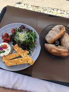 It was like a nice resort. There was chair service with cocktails and food. I had my first Aperol spritz. I also had my second. I think they’re one of my new favorite cocktails! I also ordered an amazing plate of food – whipped goat cheese layered with roasted peppers, served with roasted tomatoes, salad and focaccia breadsticks. A perfect seaside lunch.