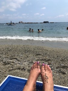 So I wandered around Monterosso until I was nice and sweaty (oh wait, I already was) and then headed for the beach. As expected, the main beach where you could rent a chair was already full, so I walked down a bit to the second beach. The “beach attendant” was a 70 year old man in a white speedo sitting at a small wooden desk under an umbrella. A chair with no umbrella was 12 euro. He wrote it out. His 1 looked like a 2 so I kept thinking he was trying to charge me 20 (I can only count to 6 in Italian) but in reality he was actually offering me a discount. It was 10. Ok great. The younger guy who could speak English showed me to my chair, primo location, a couple feet from the water. Ok, this will work.