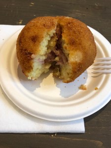 I found a spot to sit and tried to control myself and actually enjoy my crostini. It was so so good! Ok, what next? I found a stand selling giant arancini, which is a ball of fried rice (like good risotto rice.) They were as big as baseballs. I got one stuffed with prosciutto and a little bit of cheese. The rice was seasoned a bit with almost like a chicken bouillon flavor. It was not too salty but the flavor was amazing. And of course, how can you not love anything stuffed with prosciutto?