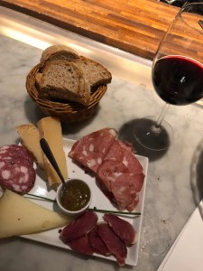 Afterward I was walking along and happened upon the wine bar I’d gone to on Saturday. I had time to kill and needed a little snack before dinner so I went in and sat at the bar (at first I was the only one in there). I tried my hardest to decipher the menu but I couldn’t so the guy behind the counter offered to help. I told him I just wanted some meat and cheese and he said he’d put something together for me. I told him not too much, I just needed a snack. Well, you can see below what it ended up with. It was nearly a meal! Salami, mortadella and boar salami. Two kinds of pecorino cheese (one was a little funky). And a really nice fig jam. Plus a nice red wine. I’d really been wanting some charcuterie so this was perfect.