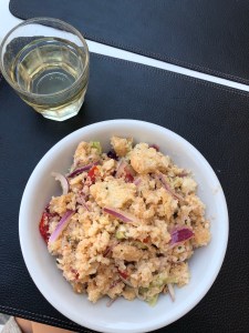 Then I literally walked in circles trying to figure out where to eat lunch. This is one of my shortcomings – I overload myself with food options and then I can’t make a decision! I settled on this little spot that I’d read about in another travel blog and grabbed a seat outside. I made a good choice. They had a really simple menu – sandwiches, salads and some specialty plates. I chose a panzanella – because I like it and wanted to try the real thing. So, the real panzanella is not like any recipe I’ve ever made. It’s literally torn soggy bread (soaked in maybe some sort of vinaigrette) and then a few veggies mixed in (cucumber, tomato, red onion). It was really good – the flavor was great and it was nice and light – but definitely not what I expected. And it was super filling! I had a glass of wine with it, which was only 2 E (which makes me question why wine is so overpriced in the US??)