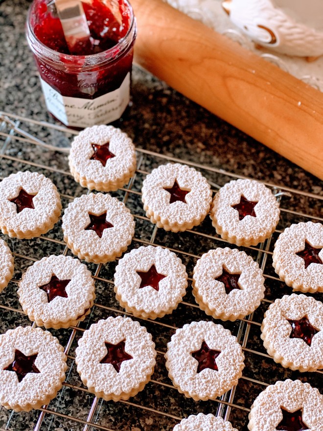 The best recipe I found is from Pardon Your French who, coincidentally, I follow on Instagram. But I’d never been to her website before. The instructions were easy to follow and I had just come across a set of linzer cookie cutters which I knew would be perfect for the endeavor. (If you don’t have fancy cookie cutters that’s ok – just use a round cutter, and then a slightly smaller one to cut the holes.)