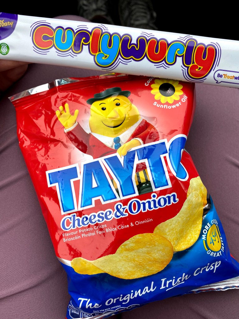 Speaking of snacks, I enjoyed a few that are unique to Ireland (and maybe the UK also). The “99” is a vanilla soft serve ice cream cone with a stick of flaky Cadbury chocolate. You typically buy them at a garage (gas station). Tayto crisps are the national potato chip, and the cheese and onion were to die for (I brought two bags home and wish I’d brought more).